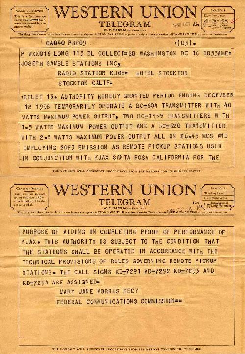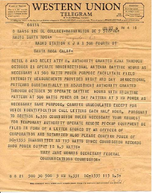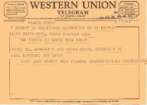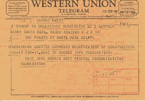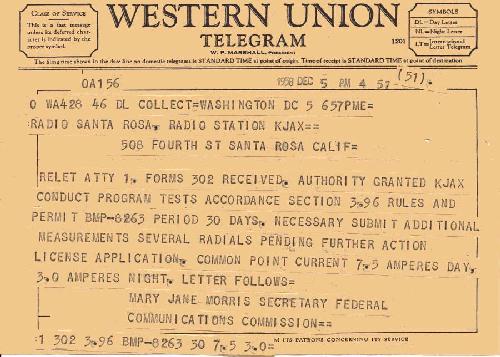 Here are some Western Union Telegrams from the FCC for radio station KJAX, Santa Rosa, California. These were for the initial authorizations. These are dated in 1958. The station went on the air as KJAX. Later call letters were KPLS, KVRE, KRVE, then finally KMXN.